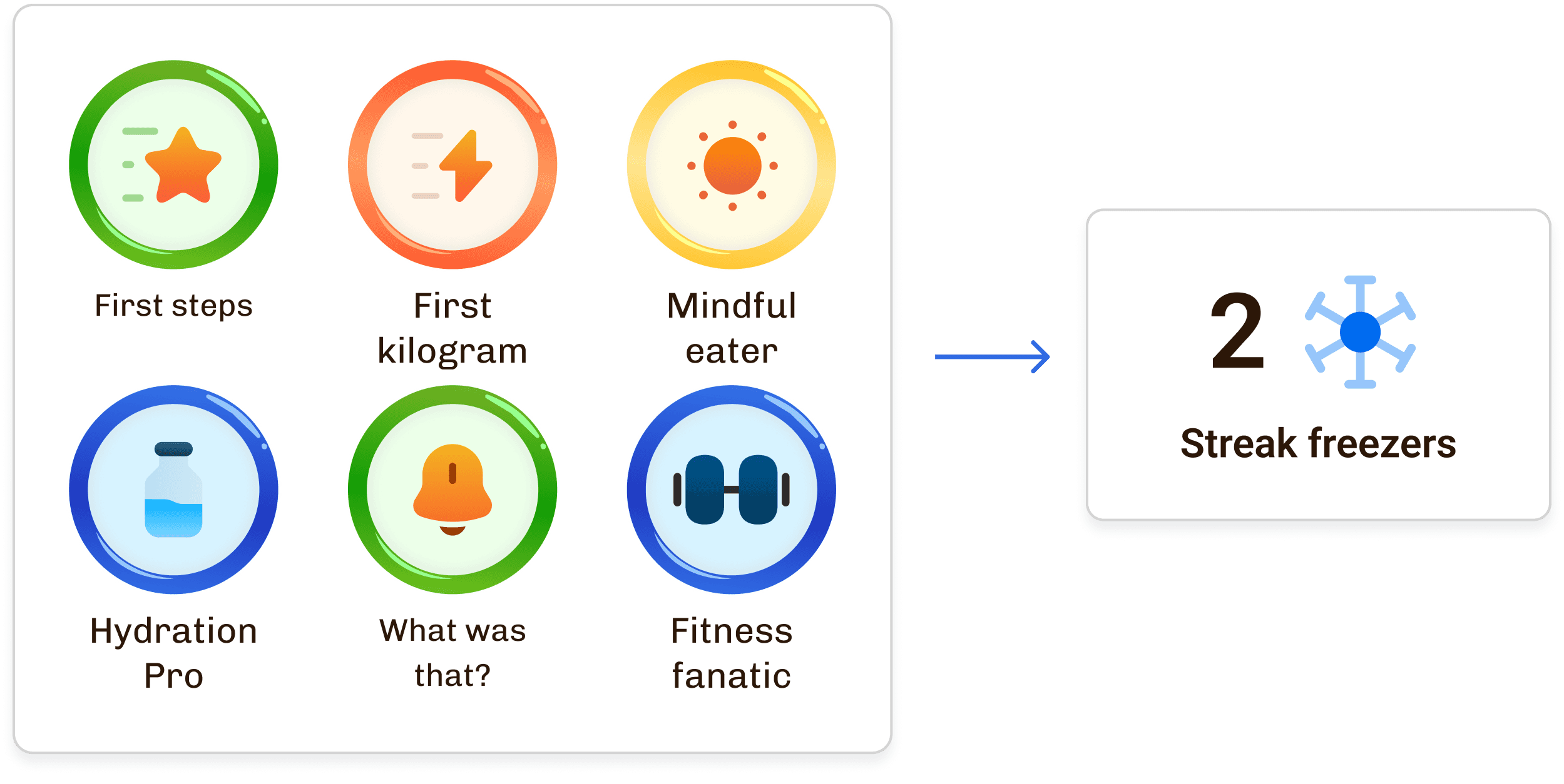 For specific activities, such as regular food tracking, sticking to a diet, and physical activities, the user would receive rewards. This helped create the sense of a game that I wanted to achieve. Additionally, as part of the rewards, users could unlock a "streak freeze." By using it, they could skip one day of maintaining a healthy habit without losing their progress.